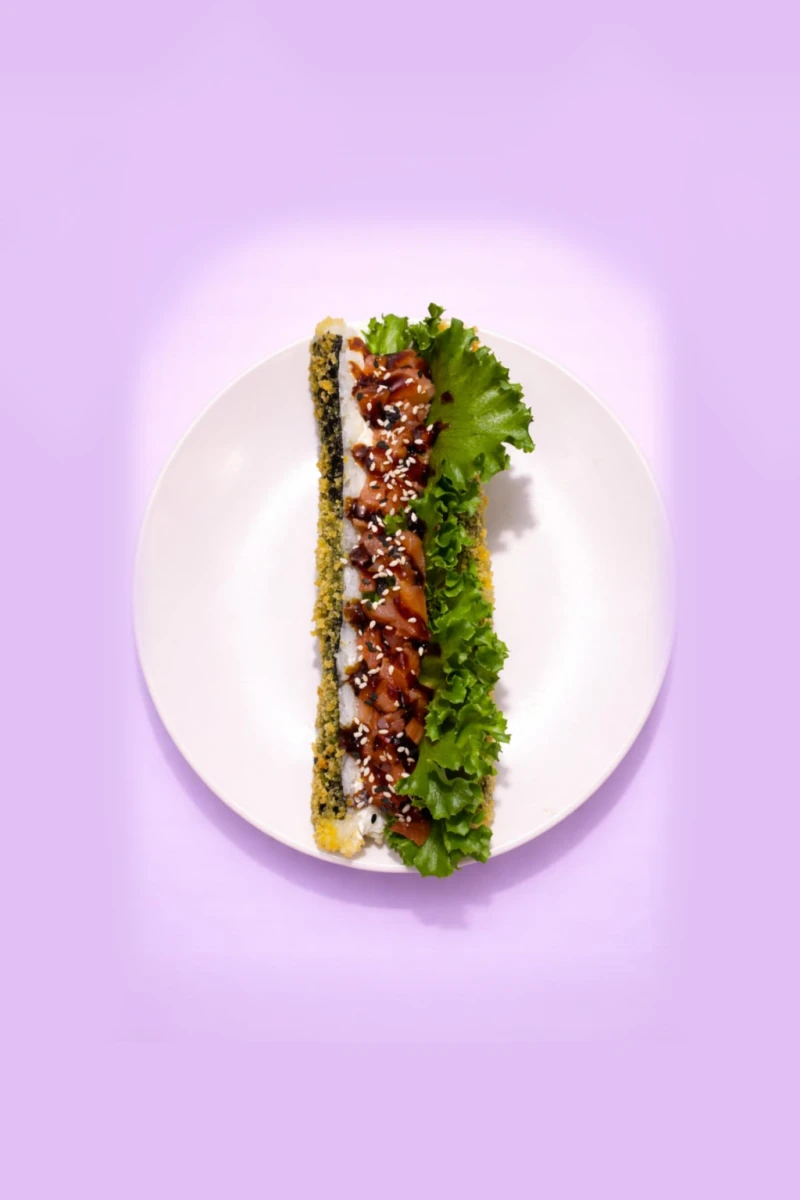 Хот‑дог‑ролл с сочным лососем, творожным сыром и хрустящим листом салата, полит соусом унаги и посыпан кунжутом, обжарен до золотистой корочки.