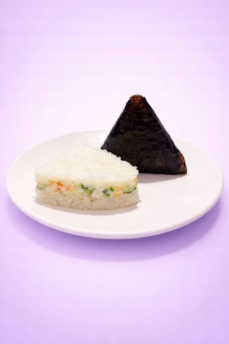 Онигири с нежными креветками, дополненные освежающей нотой огурца.