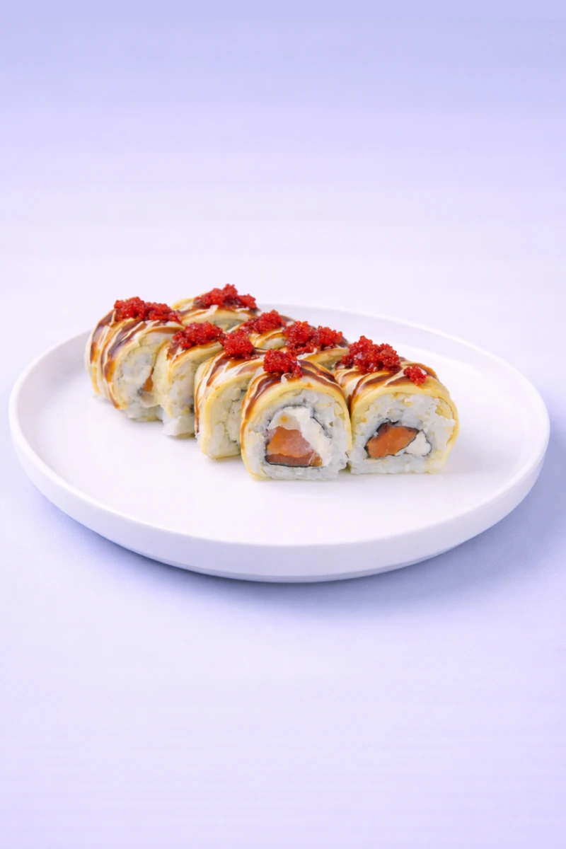 Нежный ролл с большим количеством спелого авокадо, сливочным сыром и лососем, украшенный соусом унаги-майонез и красной икрой. Мягкий, насыщенный и по-настоящему «шиковый» вкус.